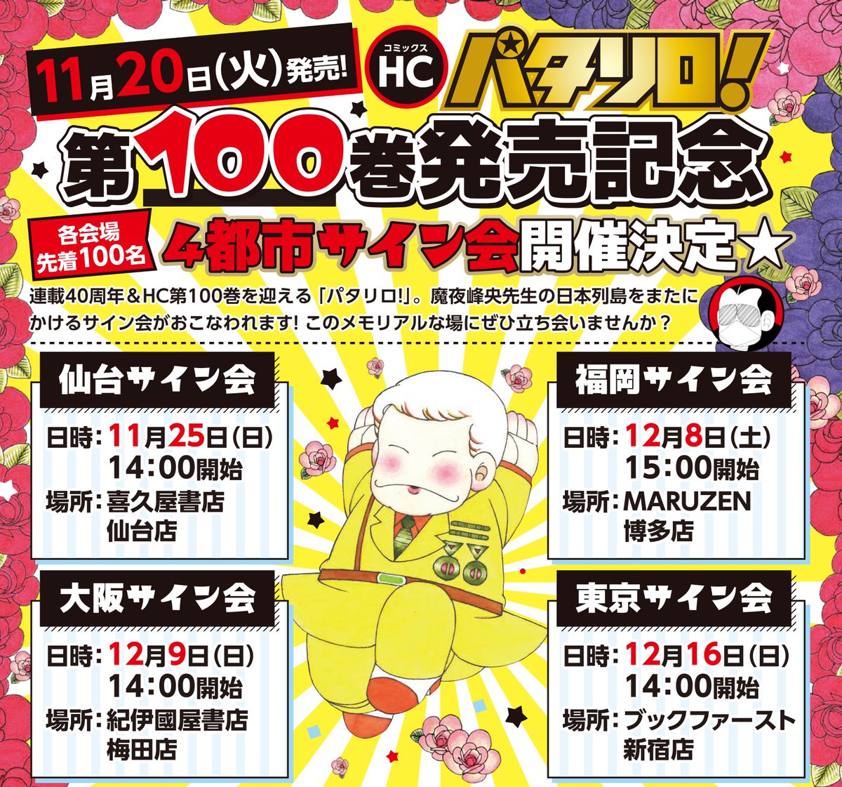 【パタリロ!100巻魔夜先生4都市サイン会】明日11月20日より12/9大阪&12/16東京の申し込みスタート(12/8福岡は【11/23】より開始)。そして仙台も含めての参加者特典発表😀なんと魔夜先生ご本人が写っている特製ブロマイドカードです。ぜひご参加ください✨ #パタリロ test.hakusensha.co.jp/patalliro100/s…