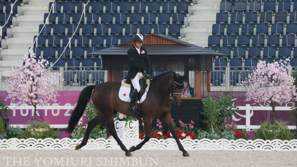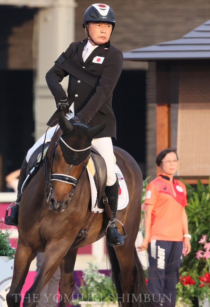 馬術個人規定で7位入賞した宮路満英。「コマンダー(経路指示役)」として付き添った妻・裕美子さんと二人三脚で挑んだ(26日、馬事公苑で=近藤誠撮影)
