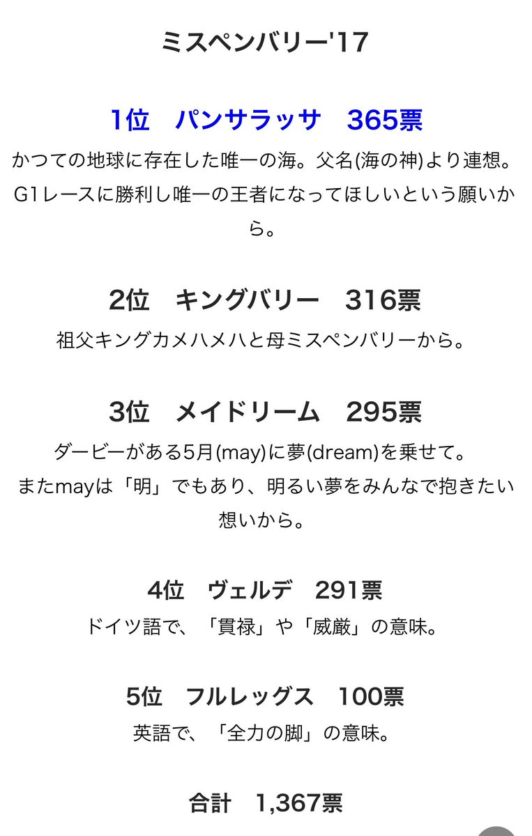 馬名は会員の投票でパンサラッサに決まりました!他にもキングバリー、メイドリーム、ヴェルデ、フルレッグスが候補として上がってました!!
