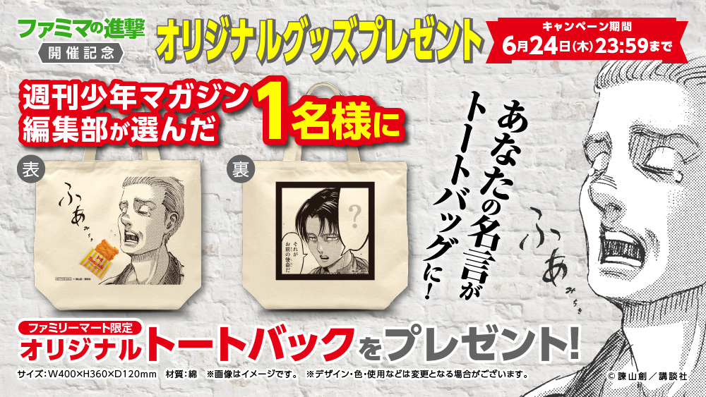 ⚔️ #ファミマの進撃 開催記念キャンペーン⚔️ ⬛後悔させるな それがお前の使命だ⬛ 1⃣@famima_now をフォロー 2⃣この投稿を引用RT、 「#リヴァイのファミマ調査報告」をつけて「?」に書き込みたいセリフを投稿しよう あなたの名言がトートバッグに⁉️ 詳しくは⬇ family.co.jp/campaign/spot/…