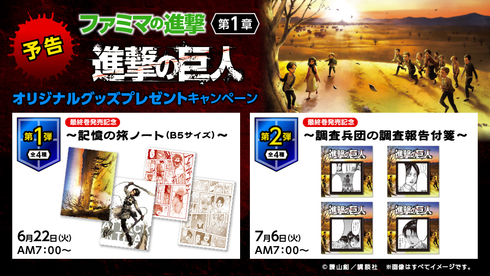 ⚔️━━━━━━━━ #ファミマの進撃 💥 本日スタート💥 ━━━━━━━━⚔️ 第1弾のオリジナルグッズは 〓〓記憶の旅ノート📓〓〓 対象商品3品購入で入手せよ‼️ 「 #進撃の巨人」の【記憶の旅】を辿れ‼️ あなたの思い出のシーンはリプで答えよ‼️ 🔽詳しくは family.co.jp/campaign/spot/…