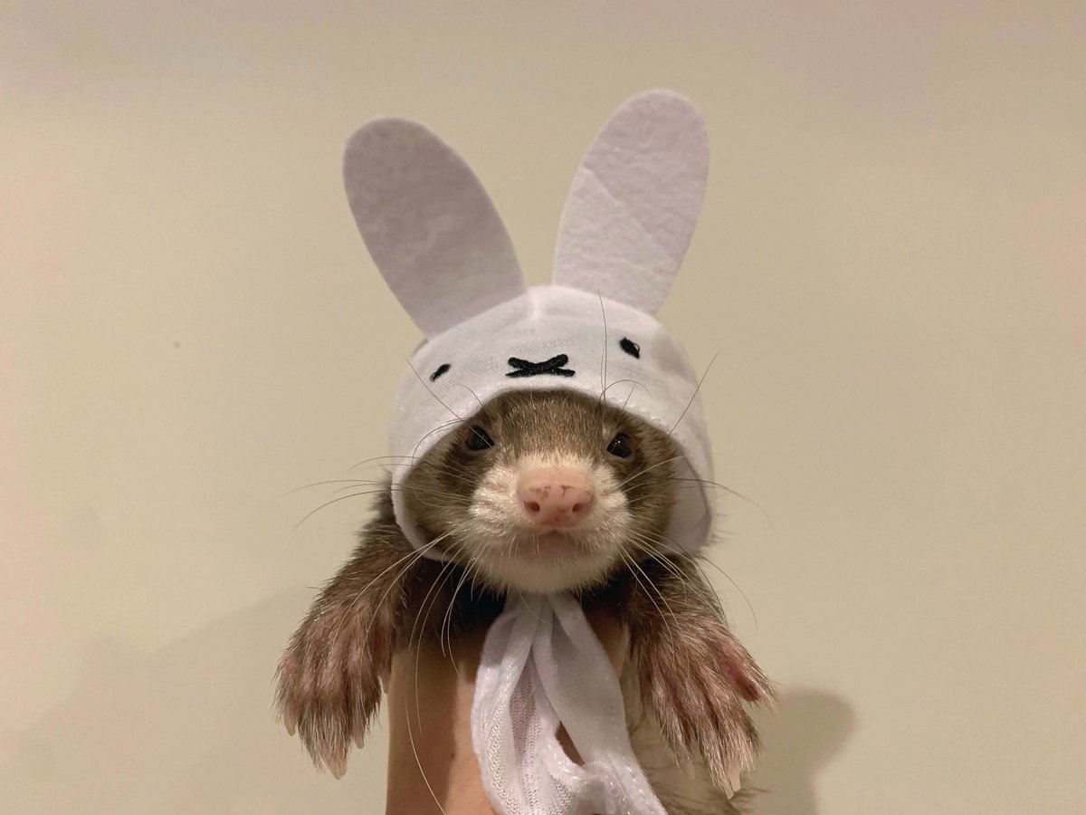 職場の先輩からミッフィーの被り物を頂きました! 私も職場でミッフィーのスクラブを着ているのでお揃いです〜 被り物はいつも3つ揃えていたので、こういう時にもまだ三男のいない寂しさを感じます…。 #フェレット