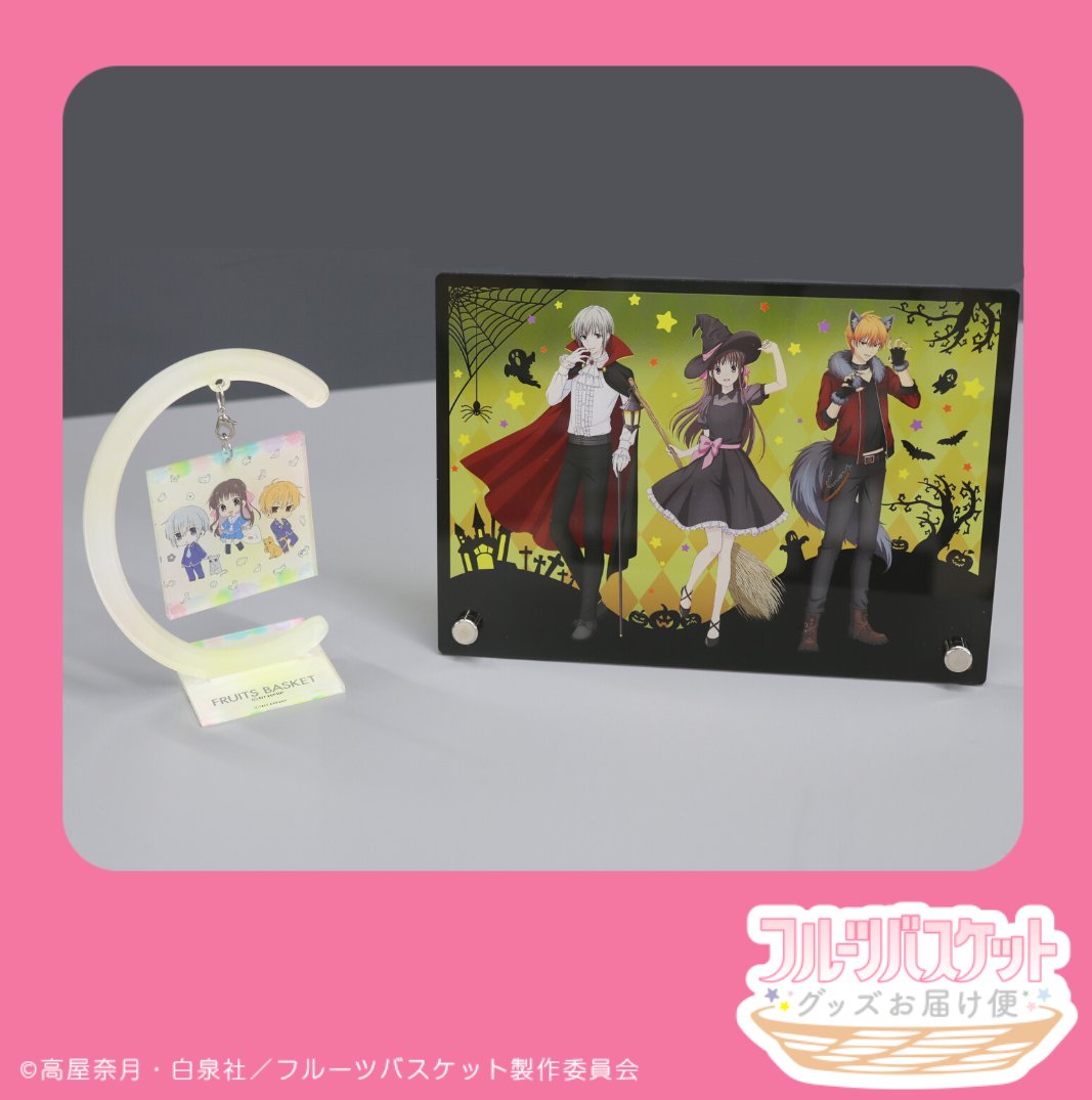 【第三弾グッズ紹介⑥】 最後を飾るのはTVアニメ「フルーツバスケット」描き下ろしアクリルアートボード🐭🍙🐱 (なんと今回のグッズお届け便のためだけの描き下ろし!) チラ見せしていたシルエットの正体はこちらでした! ハロウィン仕様で可愛らしいですよね🎃
