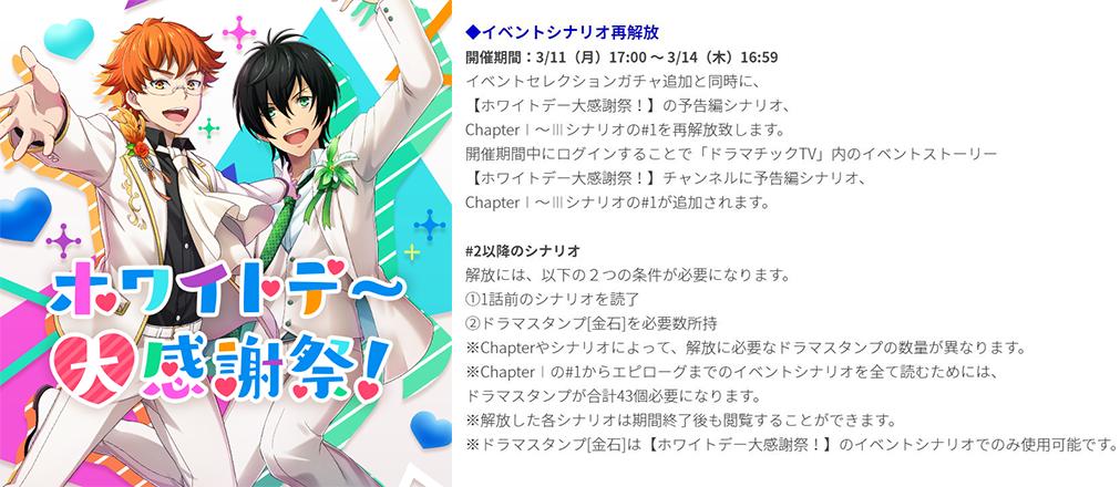 【お知らせ】『イベントセレクションガチャ』で復刻中につき、人気イベント『ホワイトデー大感謝祭!』のシナリオを一部再解放していますよ~!今すぐログインしてみて下さいね!