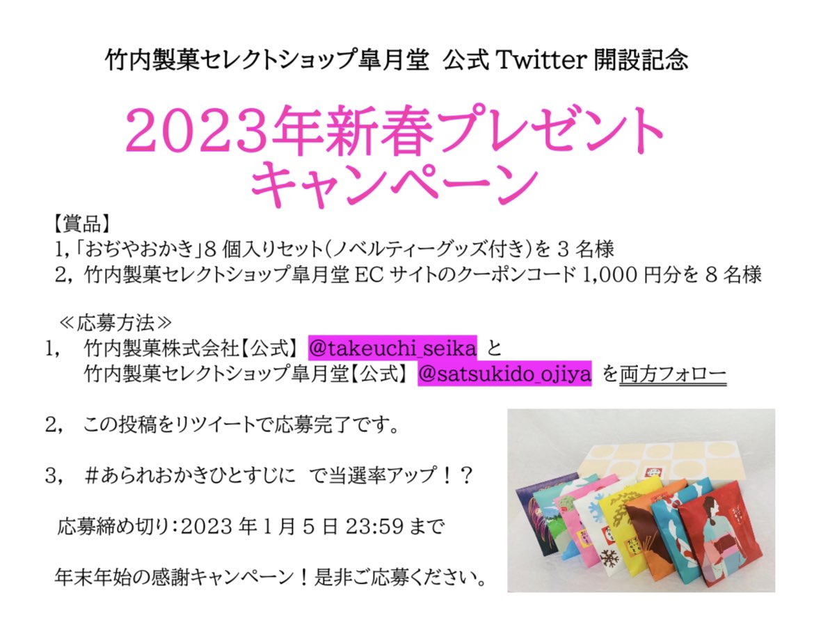 を開催🎁 【賞品】 1おぢやおかきギフトセット 3名様 2当店の割引コード1000円分 8名様 【応募方法】 1.