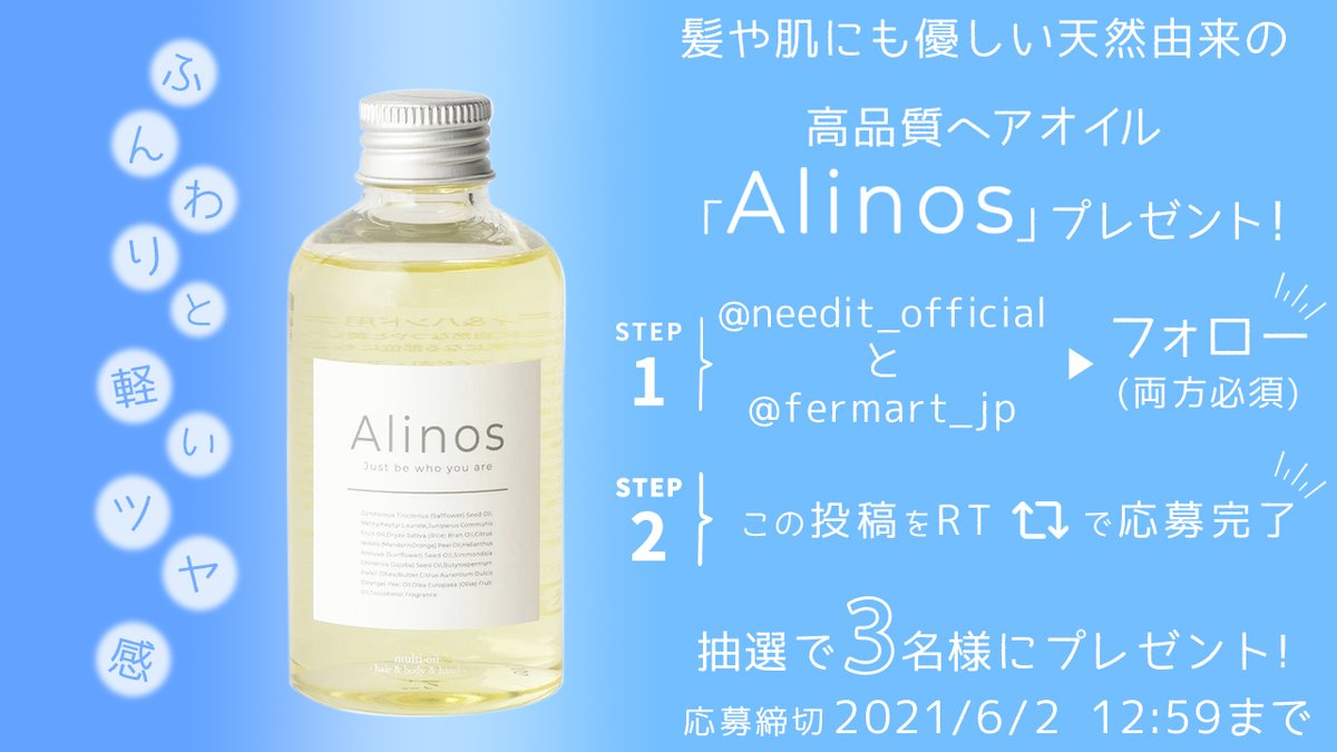 \ふんわりと軽いツヤ感✨髪や肌にも優しい天然由来の高品質 #ヘアオイル「Alinos」#プレゼントキャンペーン🎁🌟/