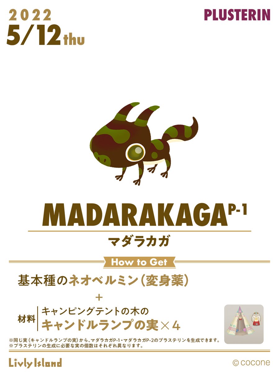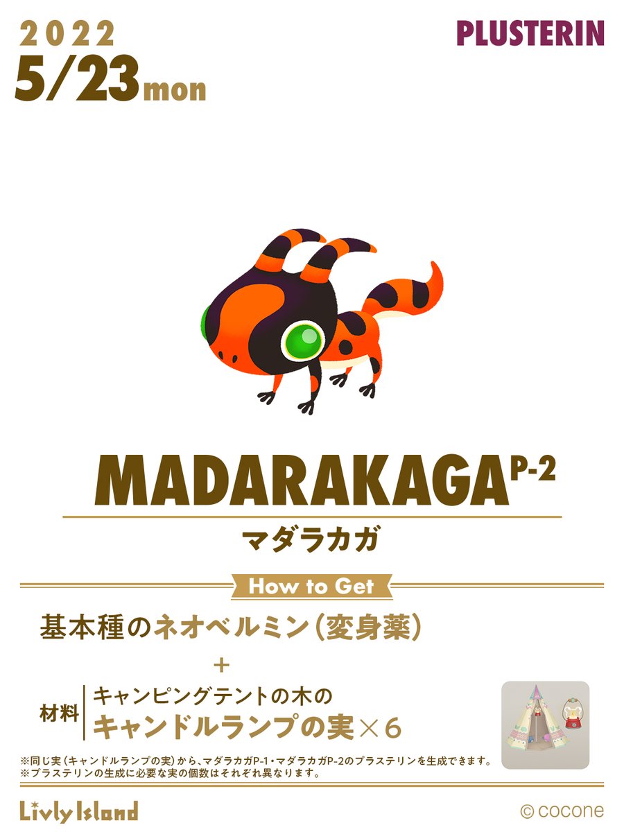 🧪新レシピ開放🧪 5/12(木)、#マダラカガ のプラステリン種(P-1)が開放されました! さらに!! 5/23(月)12:00にはマダラカガP-2が登場予定✨ P-2のプラステリンは、P-1と同じ「キャンドルランプの実」から生成できます‼️ ※必要な木の実の数はそれぞれ異なります P-2の登場もお楽しみに💖 #リヴリー