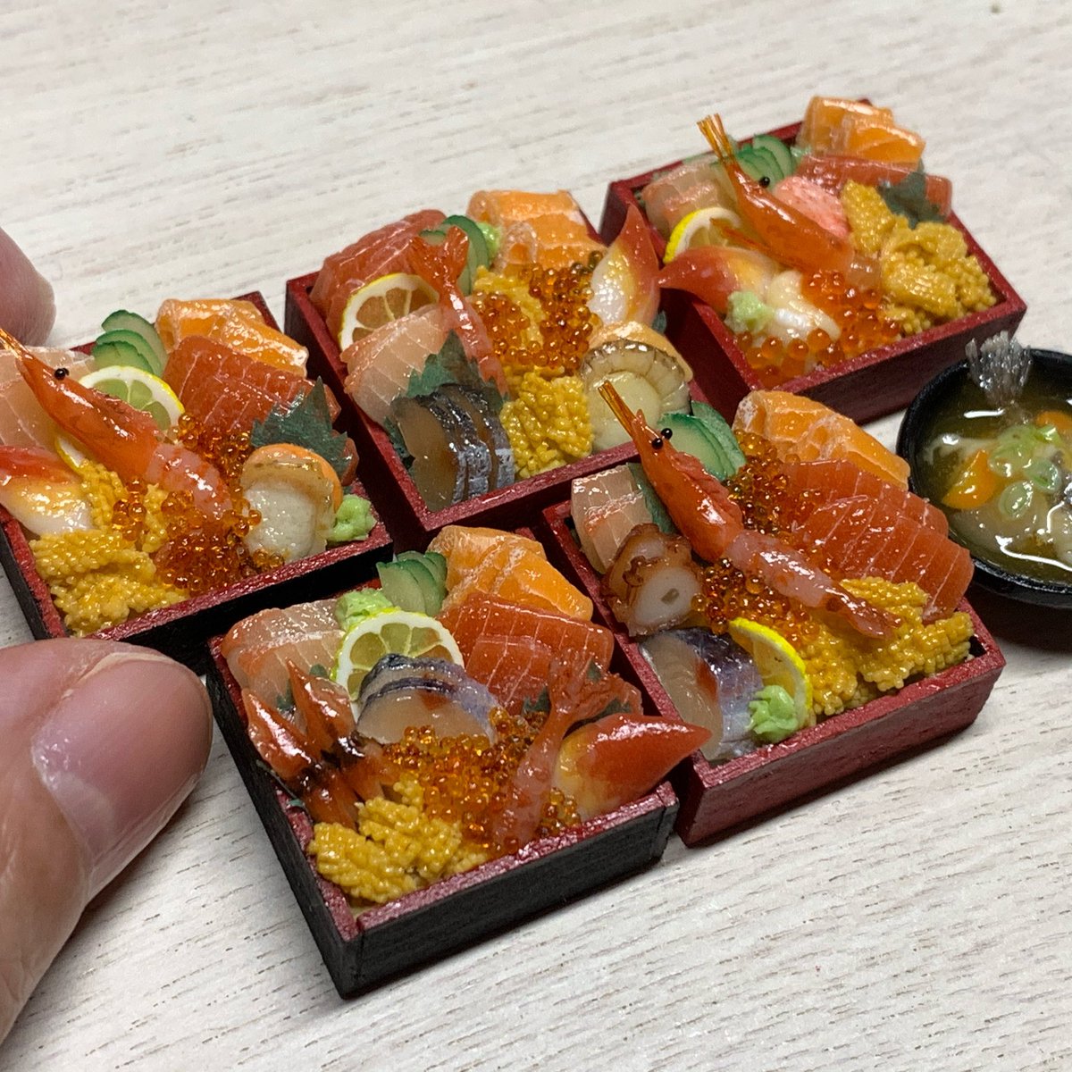 粘土とレジンで作ったなめこ汁とわかめの味噌汁、そしてわっぱ弁当2種類です☆