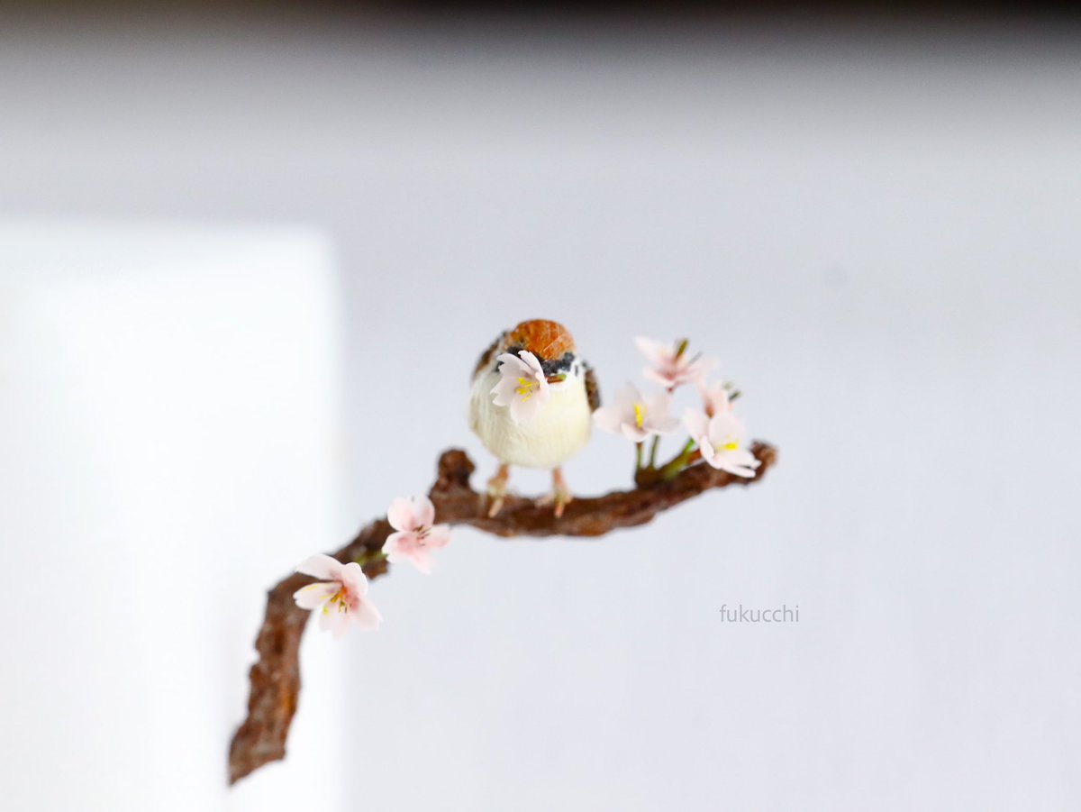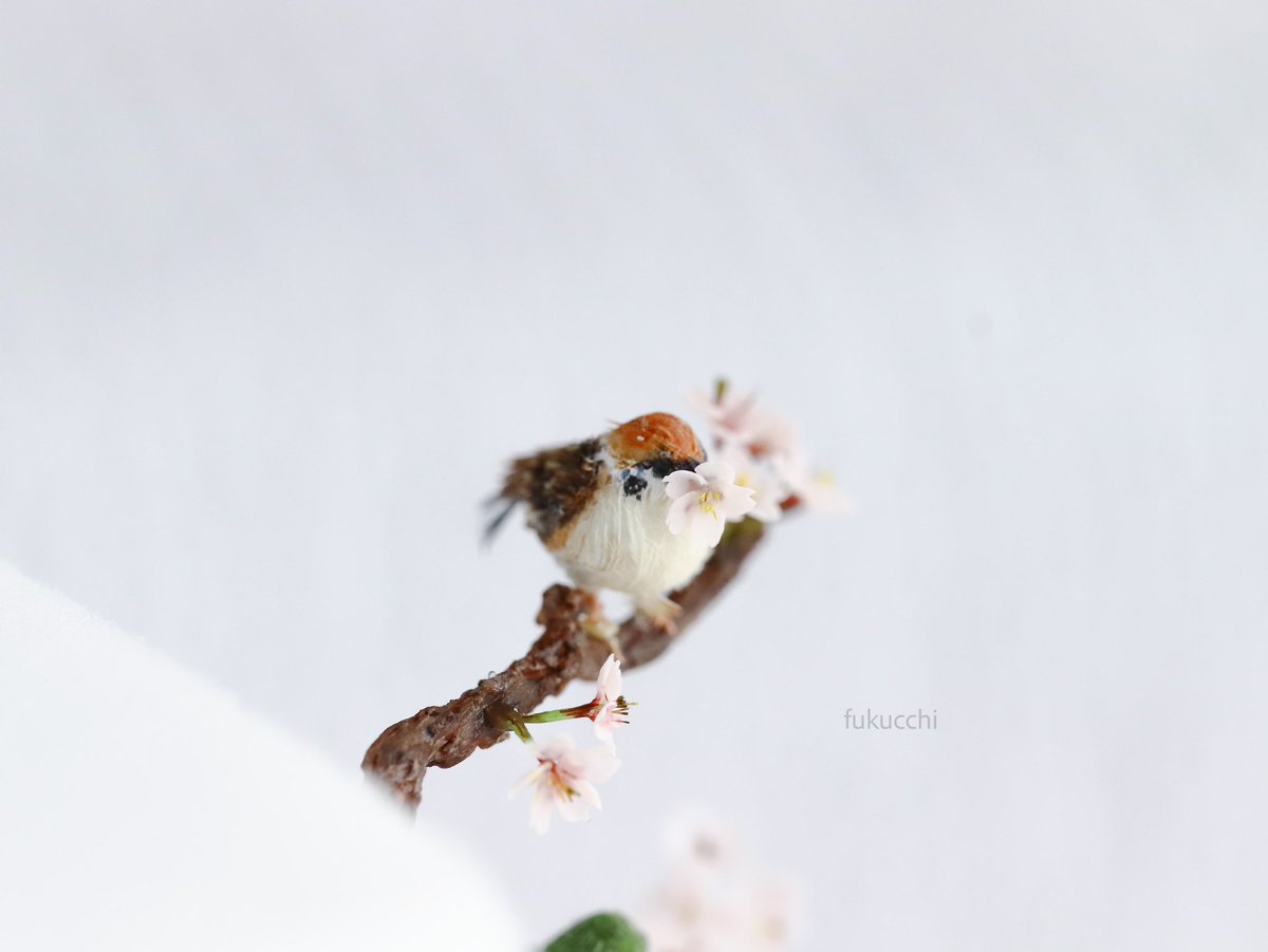 雀は花を取って付け根の蜜を吸うそうです。そんな可愛らしい姿を表現してみました。