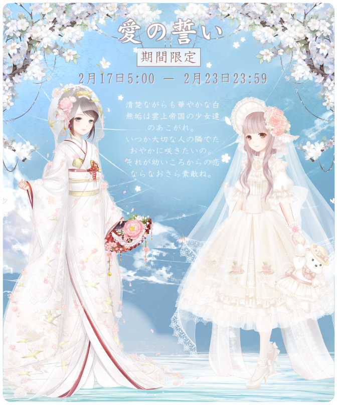清楚ながらも華やかな白無垢は雲上帝国の少女達のあこがれ。