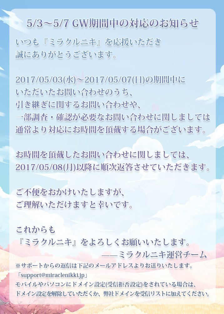 ご不便をおかけいたしますが、宜しくお願い申し上げます。#ミラクルニキ