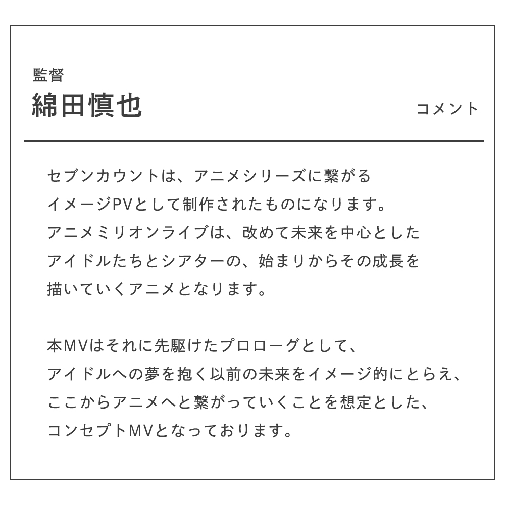 『セブンカウント』は「アイドルマスター ミリオンライブ!」アニメ化へのプロローグイメージMVとして制作し、#AnimeJapan2022 スペシャルイベントにて公開いたしました。
