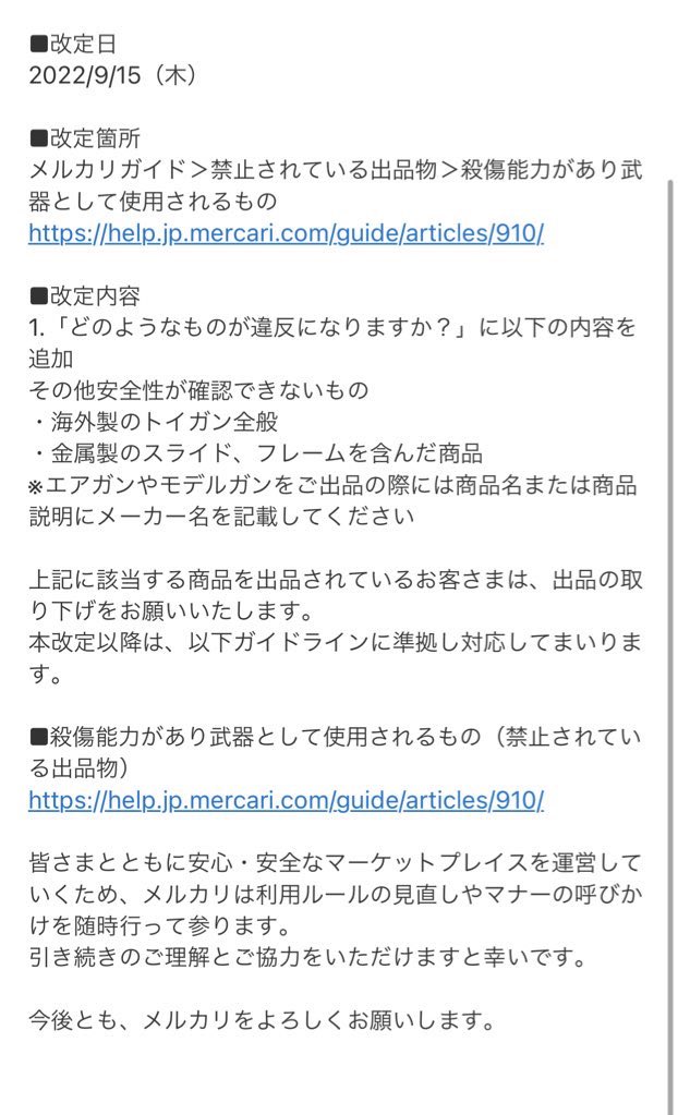 〜メルカリエアガン出品民各位〜 これからメルカリでは東京マルイ、KSC、タナカ、WA、マルゼン、マルシン、KTW、クラウン以外のエアガンは削除対象で数回やると垢凍結食らうので要注意。 パーツのみでも懲罰対象になるので、みんなでPayPayフリマに移行しよう! #ミリタリー物販 #サバゲ