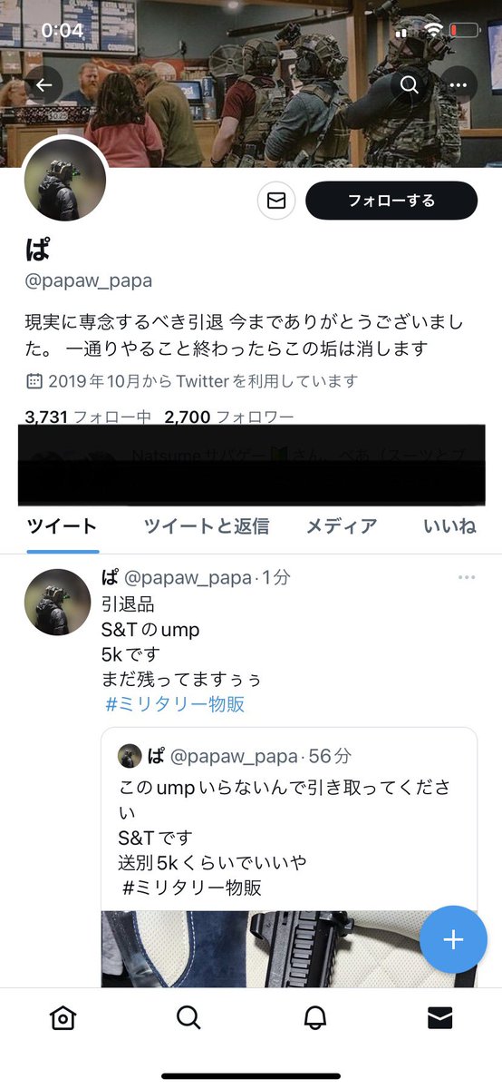 ごめんなさい!流石に看過できないので自衛も兼ねて注意喚起させていただきます! 引退と称して格安物販を掲載しては消してを繰り返しているみたいなので…! 買った商品届いてないですし、発送3回スカされてます! DMは無視、リプしたら元ツイートごと消され対応に困っています!! #ミリタリー物販 twitter.com/shuminchairsof…
