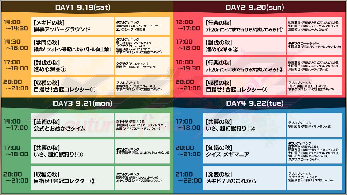 9/19(土)から配信される『シルバーウィーク特別企画 メギド72-autumn festa-』の番組表が届きました!秋の始まりを『メギド72』と楽しみましょう♪