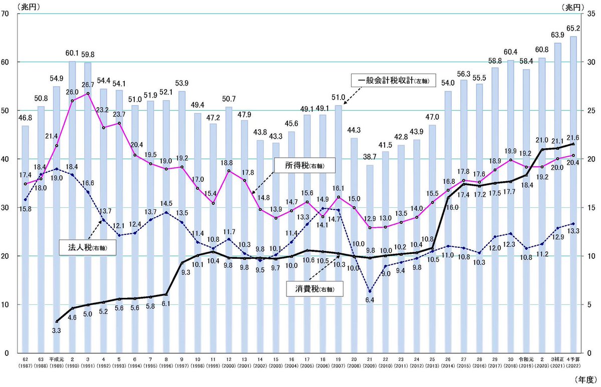 賃金が上がらない中で増税。一方で法人税は30年で半分に減税。