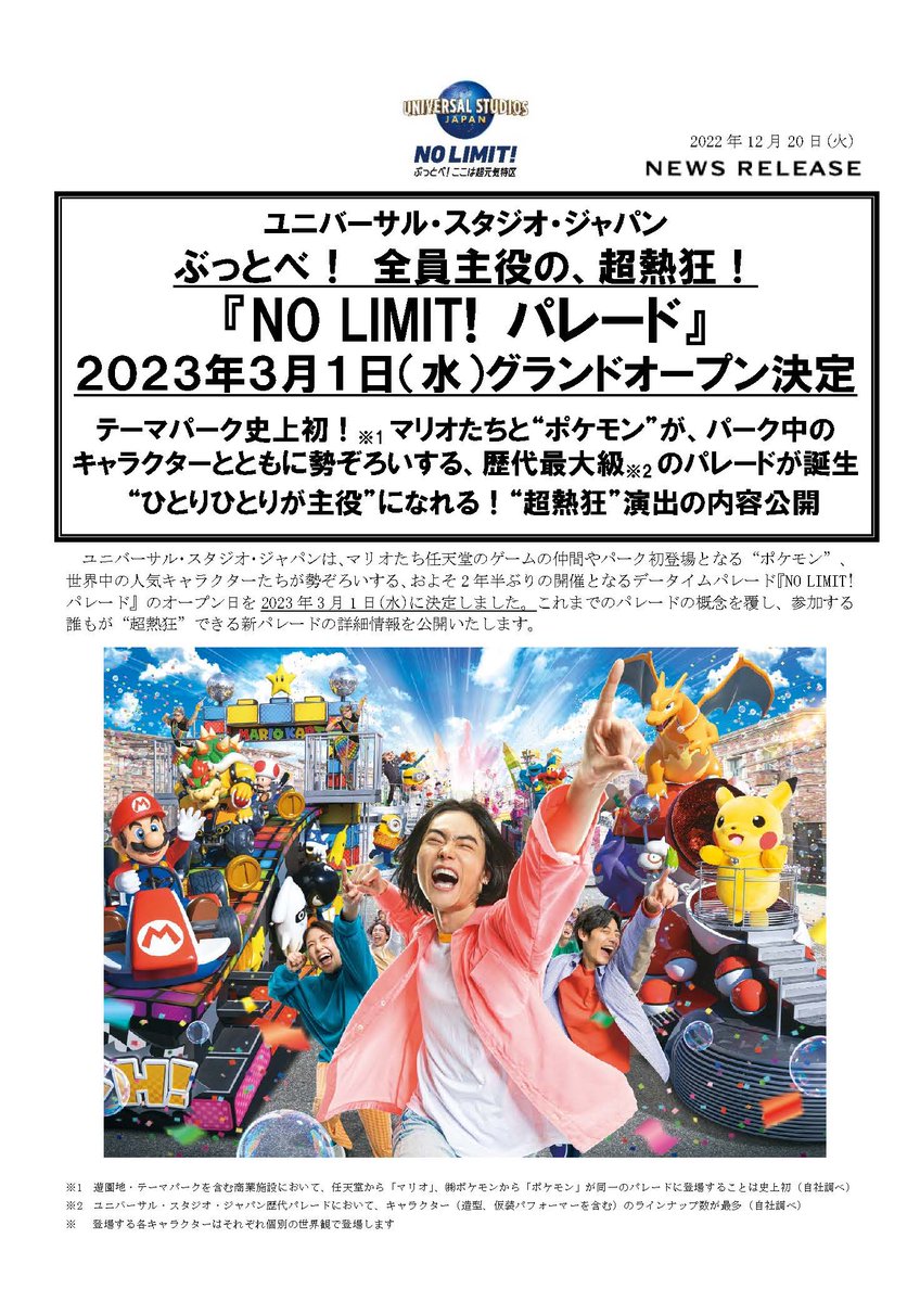 ぶっとべ! 全員主役の、超熱狂!『NO LIMIT! パレード』2023年3月1日(水)グランドオープン決定 prtimes.jp/main/html/rd/p…