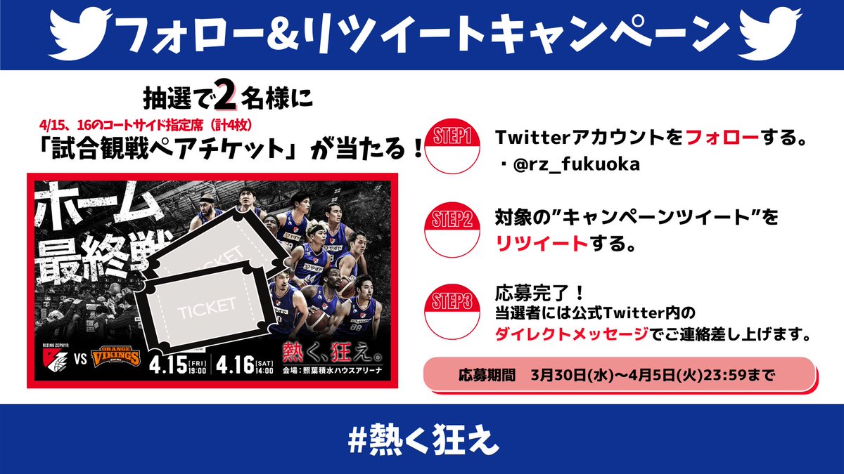 @rz_fukuoka をフォローし本ツイートをリツイートで応募完了となっています🏀