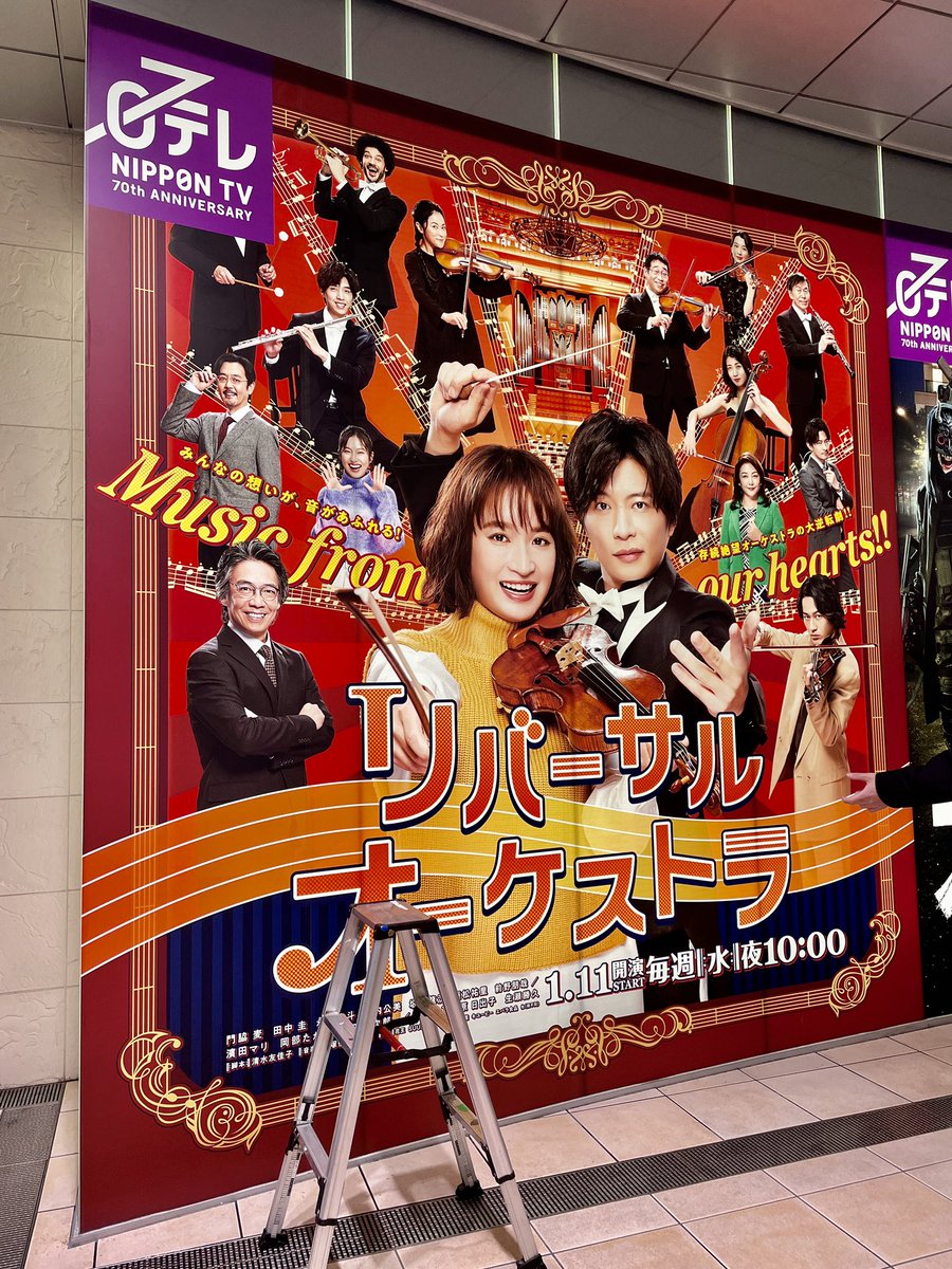 新橋駅から続く汐留の地下通路に「リバーサルオーケストラ」の大看板が設営中でした‼︎ この新ビジュアル、今にも音楽が鳴り響きそうな雰囲気があって素敵ですね♫