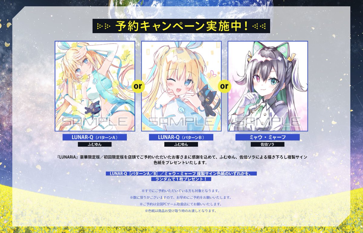 LUNAR-Q[A/B]/ミャウ のいずれか1枚をランダムでプレゼント。既にご予約いただいた方も対象です。