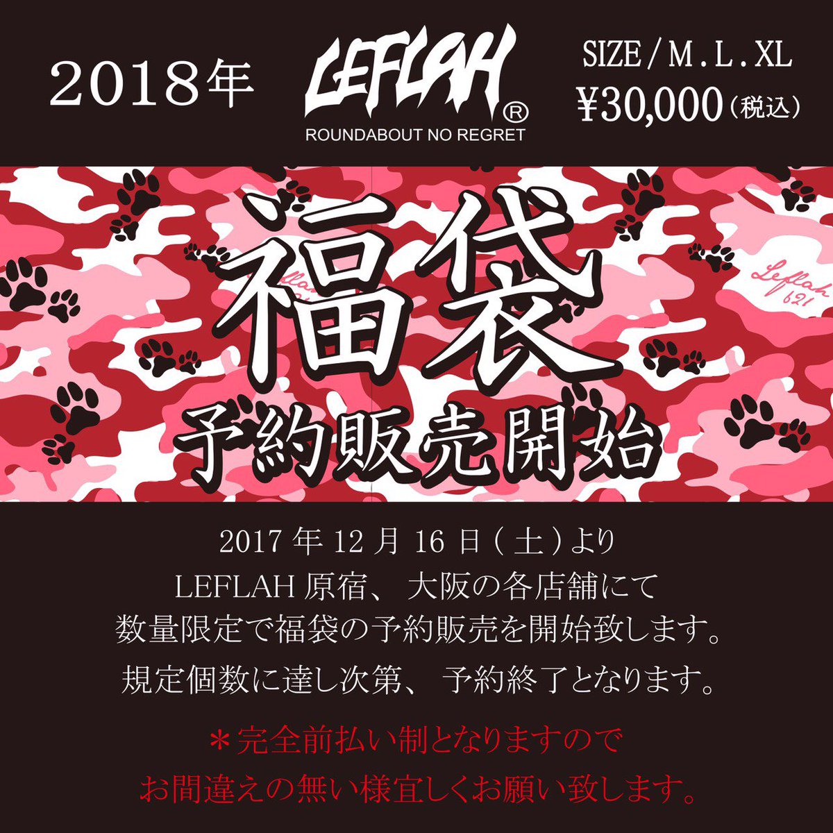 明日、16日から2018年元旦から発売するLEFLAH福袋【M.L.XL 税込30000円】の先行予約販売を開始致します‼︎