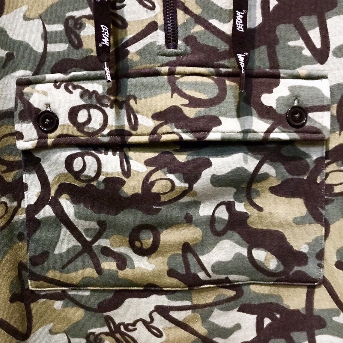 オリジナル迷彩柄の生地、ロゴ入りシューレス、センターポケットなど細部にまでこだわった1着になっています‼︎