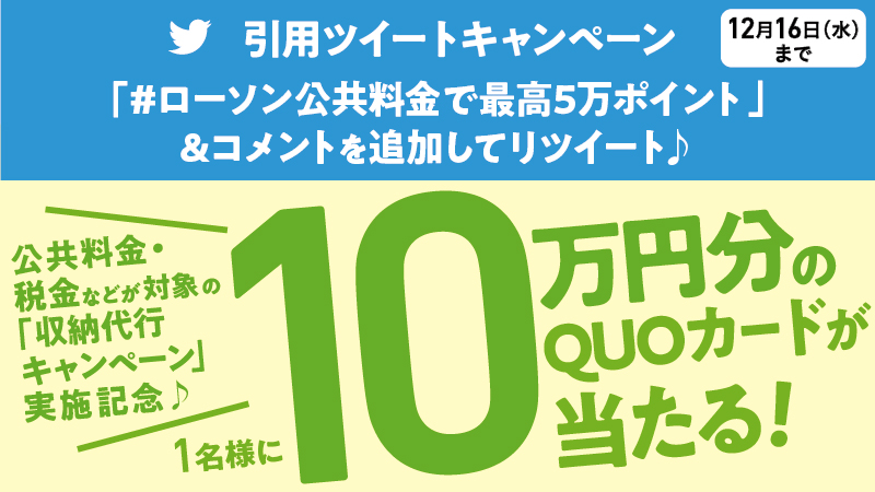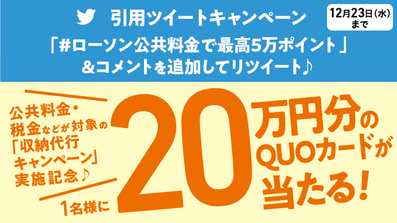 フォロー&この投稿に「 #ローソン公共料金で最高5万ポイント 」とコメントを付けて引用ツイートすると、QUOカードが当たります(^^) #ローソン