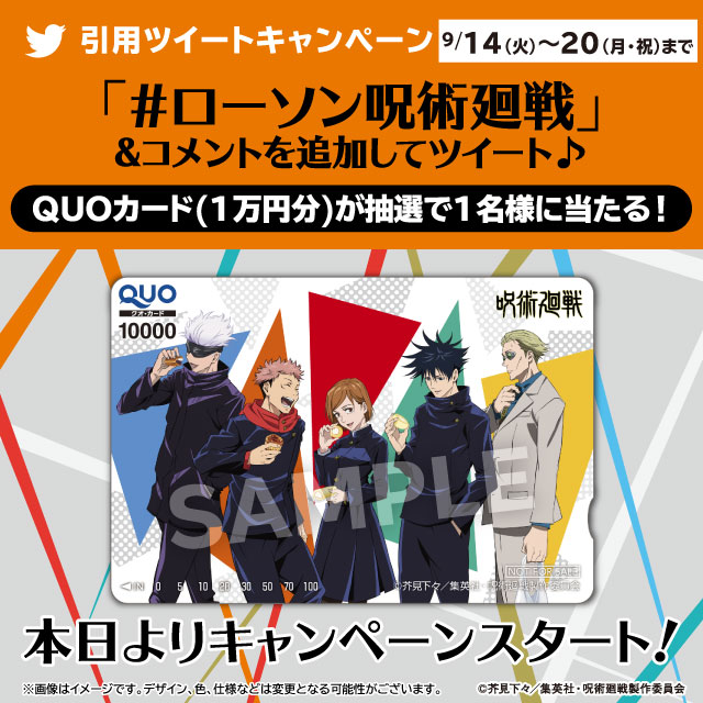 TVアニメ「呪術廻戦」キャンペーン開催記念♪ @akiko_lawson をフォローし「 #ローソン呪術廻戦 」とコメントをつけて、この投稿を引用ツイート。抽選で1名様にオリジナルQUOカードが当たります(^^) #ローソン bit.ly/3nkkGVN