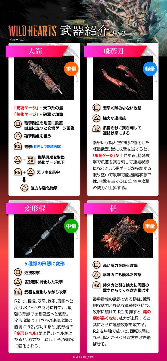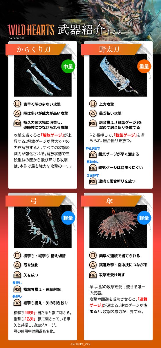 ワイルドハーツの武器紹介Ver2です。公式に説明が出たのでまとめました。コンボでモーションは変わるのであくまで基本動作の参考に。モンハンとは結構差別化できている気がします。公式見ればいいけどスマホ一覧性を重視した趣味です。ボタンはPSベースですません。