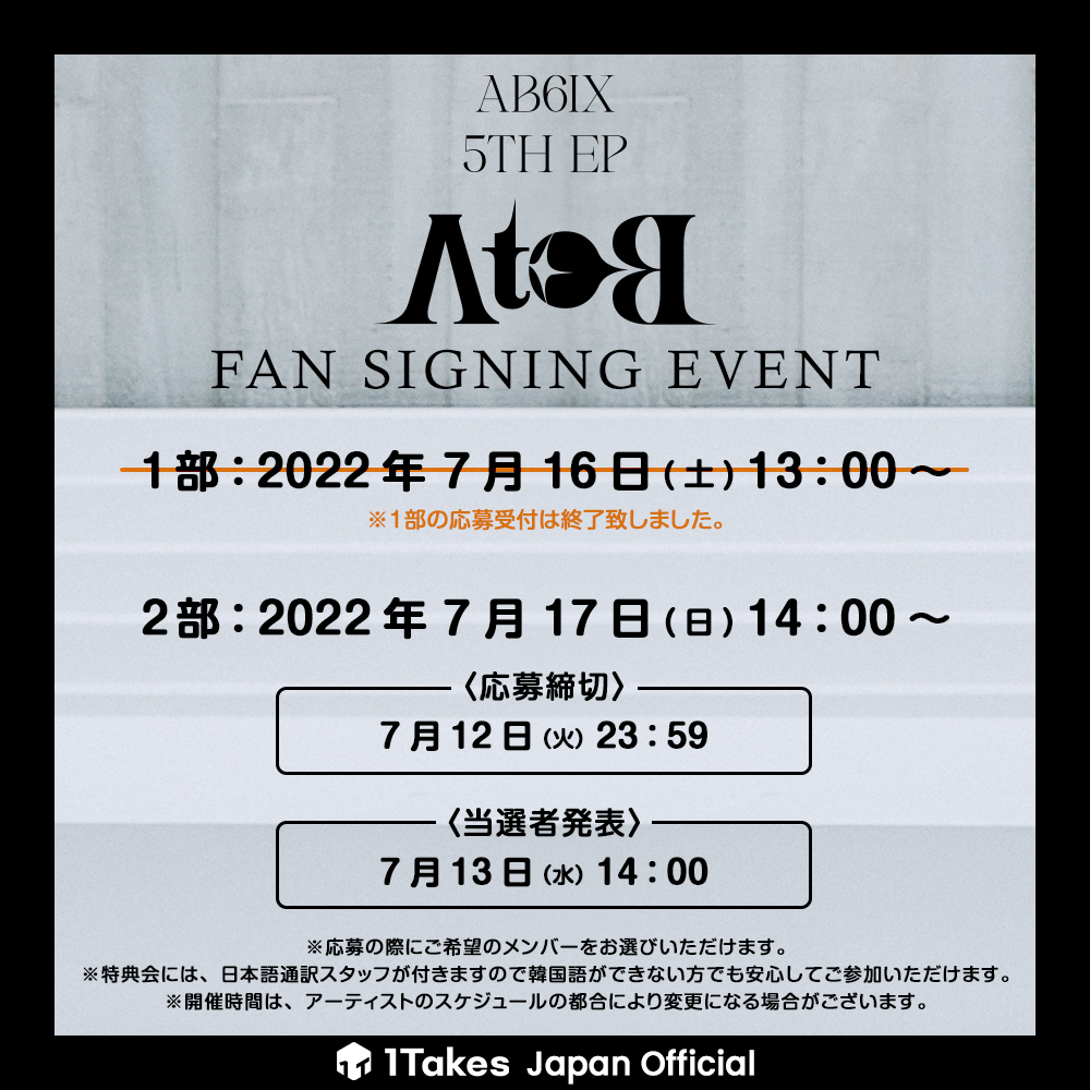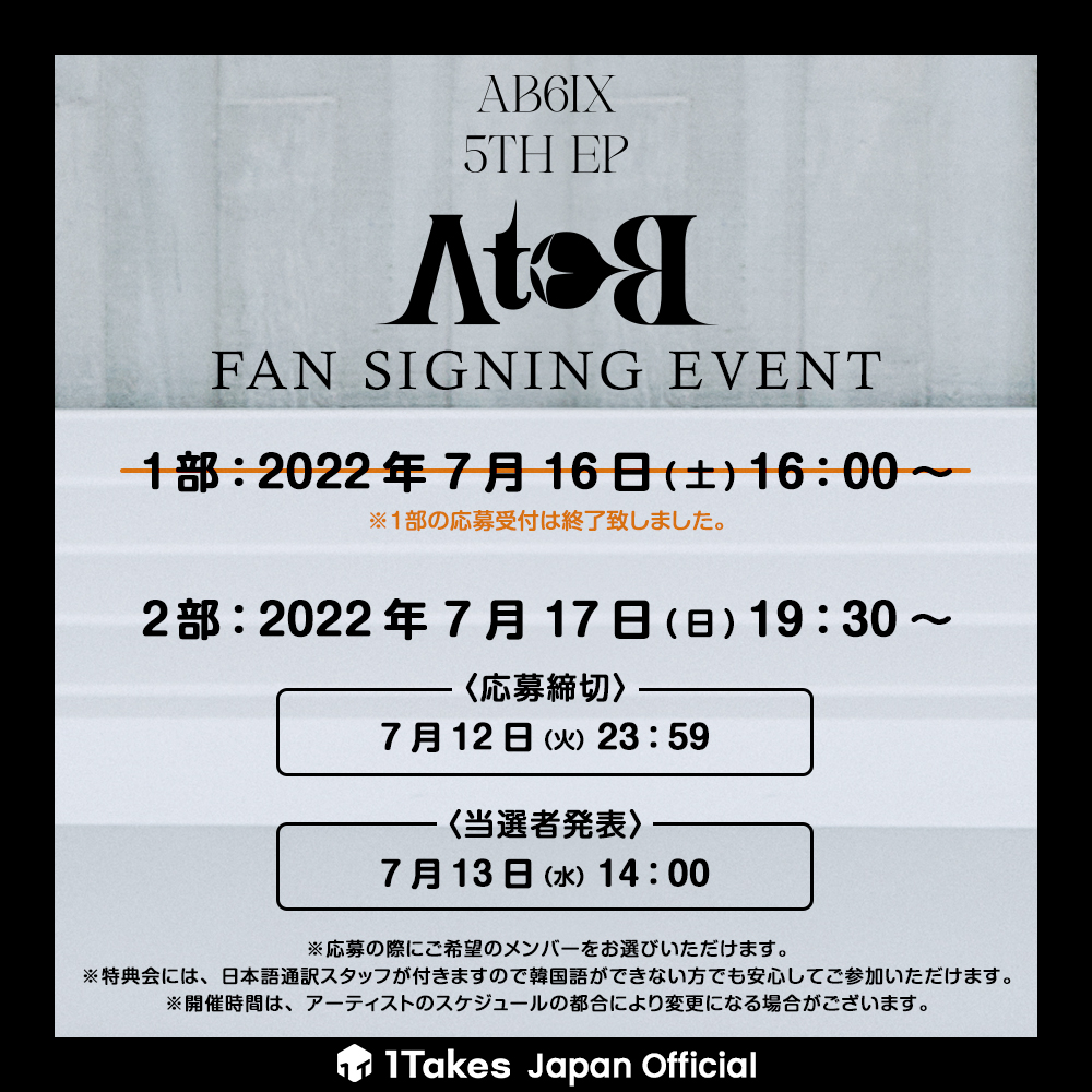 [#AB6IX] ABNEWの皆さん、大変お待たせ致しました!オンラインサイン会実施時間のお知らせです🎉 📍1部 2022年 7月 16日(土) 13:00 📍2部 2022年 7月 17日(日) 14:00 ※都合により時間変更がある可能性があります。 アルバム購入はこちら 👉🏻 bit.ly/3PTBjTU #AB6IX #ABNEW #1Takes #ワンテ