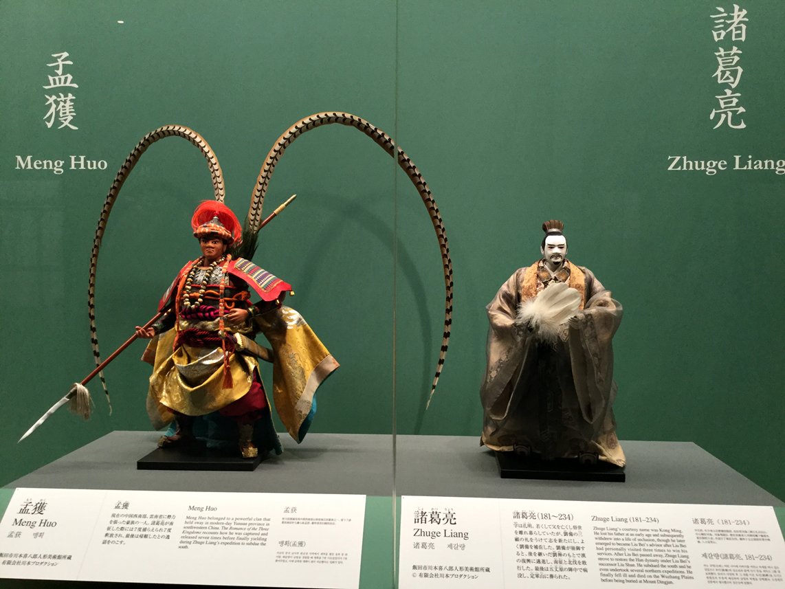 皆様ご無沙汰しています。10/1より始まった九州国立博物館での特別展「三国志」、私共も先月末に川本喜八郎人形の飾り込みに行きました。九博では1箇所の展示ケースに9体展示し、左端に孟獲と右端に孔明。真ん中に曹操です。東博とポーズも少し変え、特に曹操の目の向きが変わっています。#三国志展