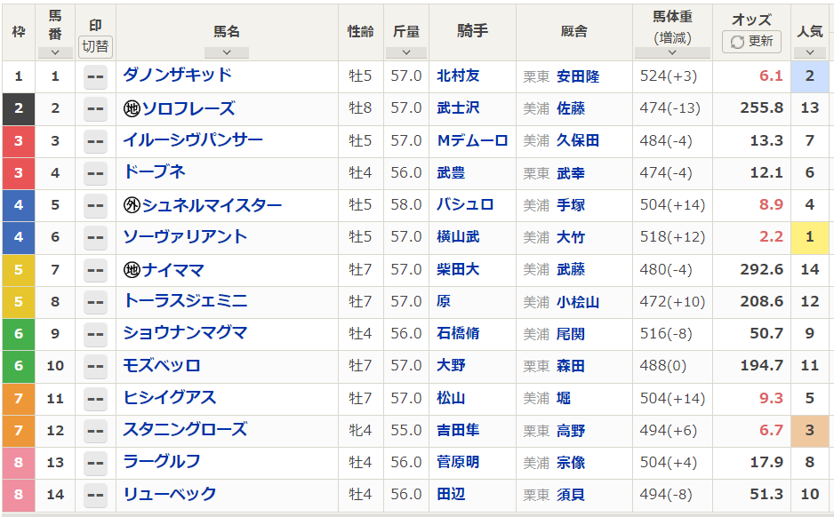 ソーヴァリアントはやや過剰人気、ダノンザキッドは不安大。この2頭は条件なしで読めますので参考にご覧ください。