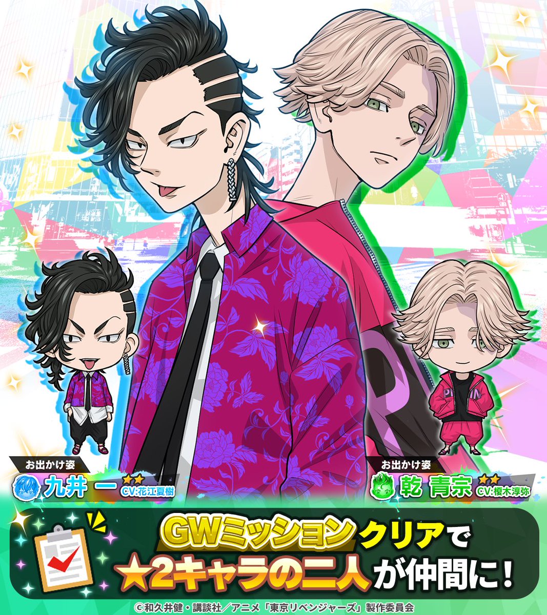 ミッションクリアで「東京卍コレクション」にも登場した★2の【お出かけ姿】 #九井一 #乾青宗 が仲間に♪