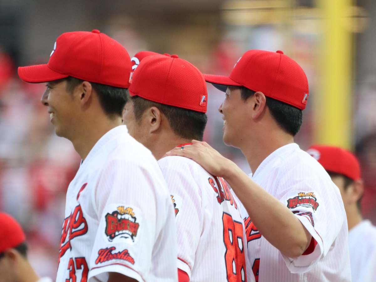 オリンピックのときもそうだったけど、こういう時はいつも菊ちゃんがいい仕事するんよ ニコニコでサッサを中央に連れて行くの本当に涙腺やられた #菊池涼介 #佐々岡真司 #カープ