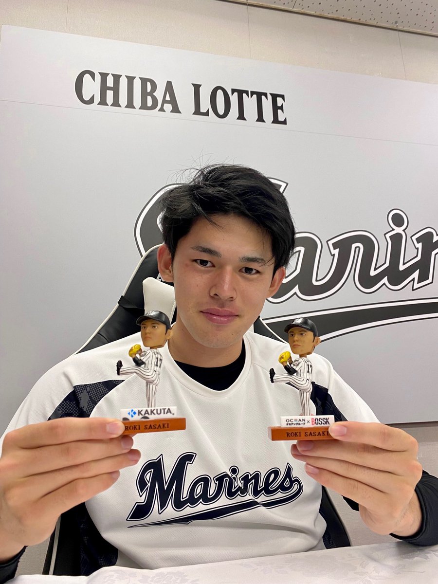 週末24、25日の #TEAM26 ファンクラブデーでお渡しするボブルヘッドが届いたので、#佐々木朗希 投手本人に実物を確認してもらいました。「どうですか?似てますよね!?」