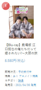 BD『劇場版 江口拓也の俺たちだって癒されたい!』がアニメイトのデイリー予約ランキングの映像部門で1位でした!ご予約くださった皆さん、ありがとうございます。アニメイト早期予約特典の江口さん&西山さんの指ハートポーズのブロマイドをお楽しみに。 #俺癒