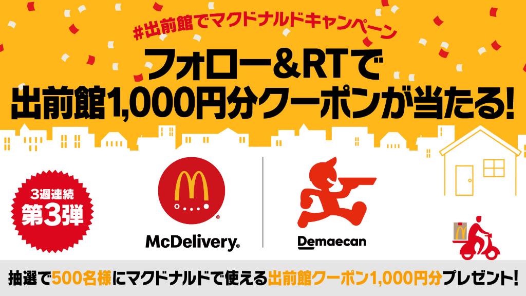 抽選で500名様にマクドナルドで使える出前館クーポン1,000円分当たる🎁