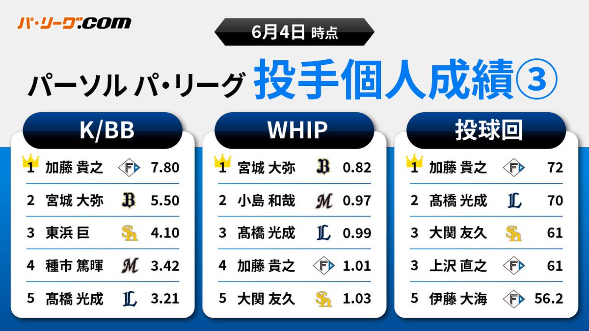 🥇WHIP:#加藤貴之 投手(F)