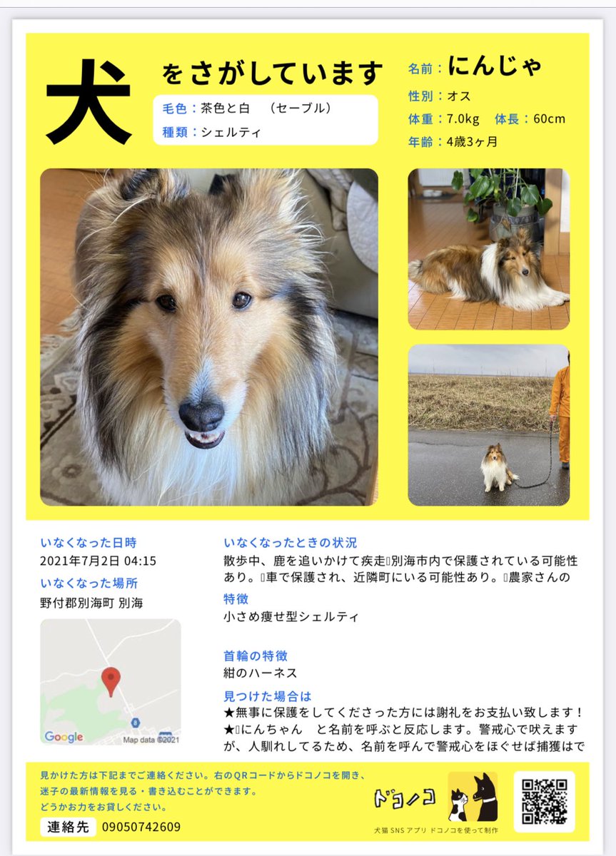 初めて北海道厚岸町太田地区で目撃情報がありました🐶 走って逃げてしまったそう。 にんちゃんじゃないかもしれないけど、小さな情報でも有り難い!感謝!走るの速いです。『にんちゃんー!』と叫べば、反応します。保護されて放し飼いの可能性あり。