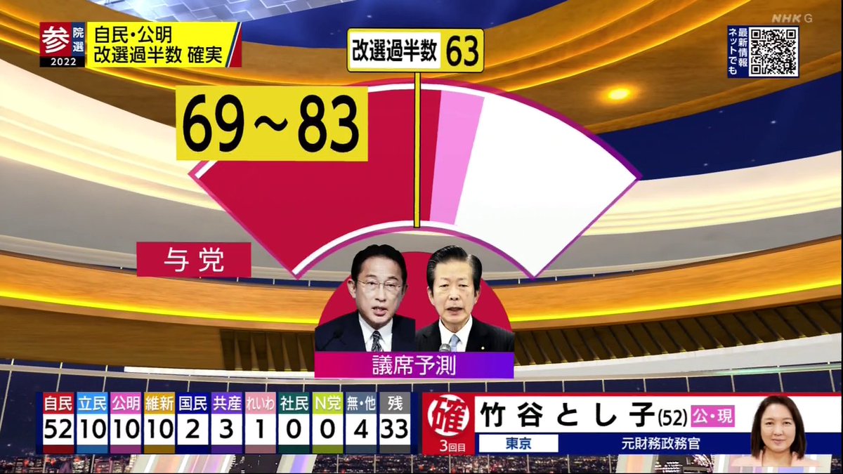 自民・公明両党で改選議席の過半数63議席を超え