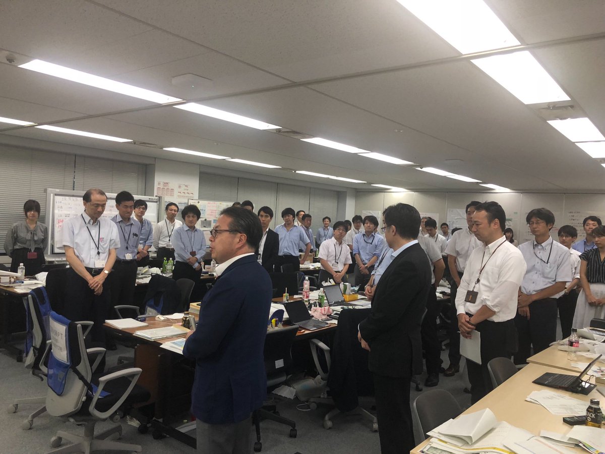 経産省の災害対策オペレーションルームを激励してきました。約100名の職員が部署を超えて一室集まり、停電復旧、供給力確保や節電対策、物資の確保・輸送に全力で頑張ってくれています。(私の左手にあと同数くらいの職員がいます)