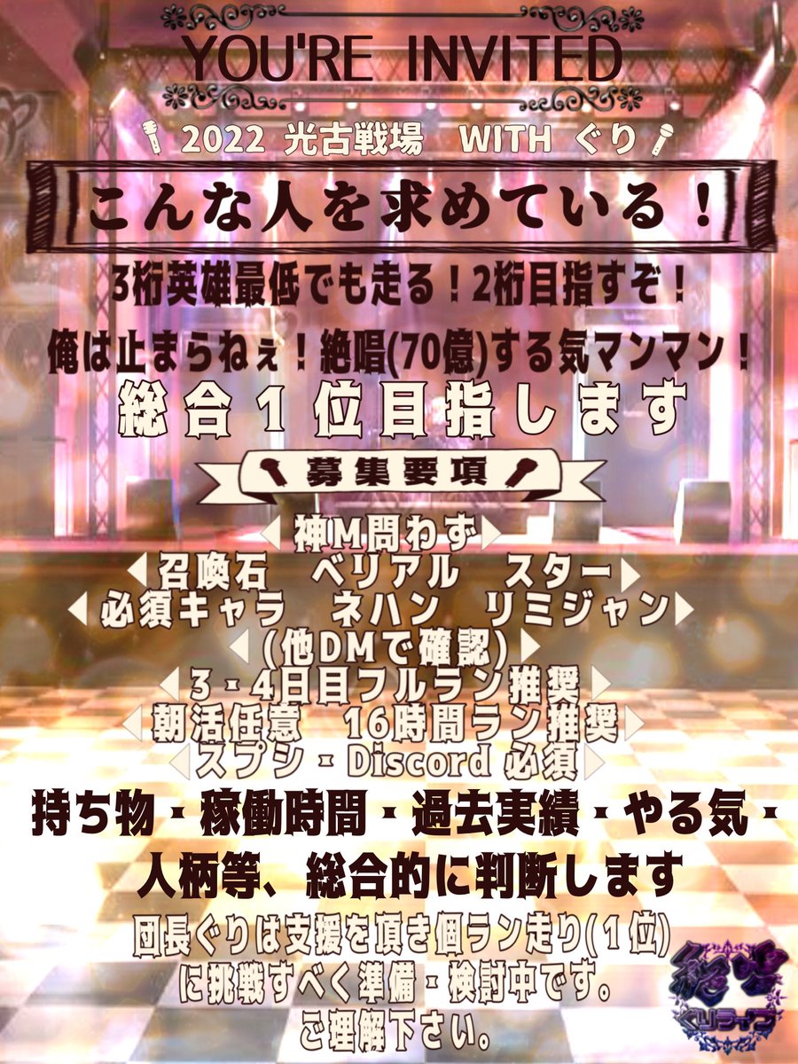 ノルマ設定はしていませんが全く走らなくてもいい訳では無いので楽しく古戦場を走れる方 是非お待ちしております