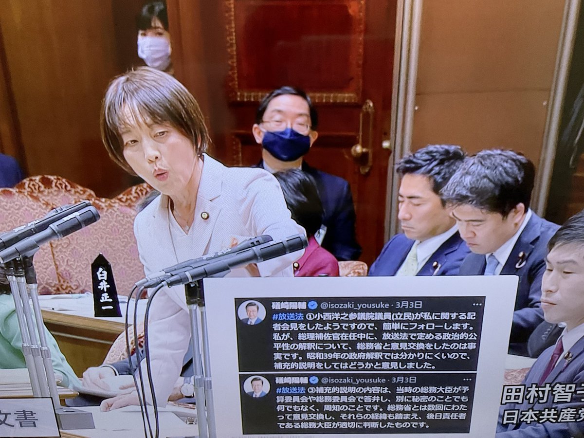 岸田「放送法について様々な議論があるのは当然のこと」この「様々」は磯崎陽輔の発言について言及しているわけだが、安倍政権下で磯崎陽輔は官僚に対し「俺と総理が二人で決める話」「俺の顔をつぶすようなことになれば、ただじゃあ済まないぞ。首が飛ぶぞ」これって「議論」?圧力だよね🤔