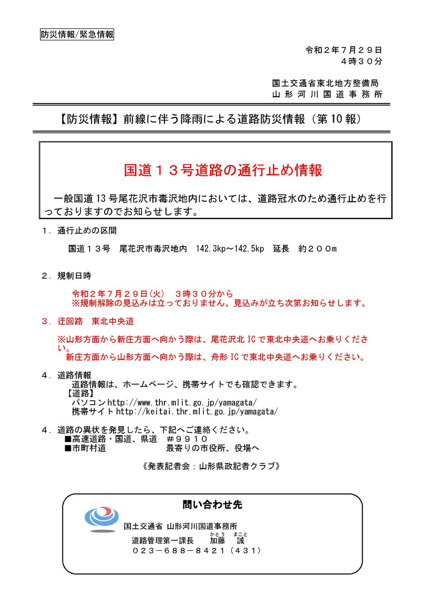 国道13号の通行止め情報 一般国道13号尾花沢市毒沢地内において、道路冠水のため通行止めを行っております。 ●通行止めの区間 #国道13号 #尾花沢市 毒沢地内 延長約200m  ※迂回路 東北中央道 規制解除の時期は未定です。決まり次第改めてお知らせします。 thr.mlit.go.jp/bumon/kisya/ki…