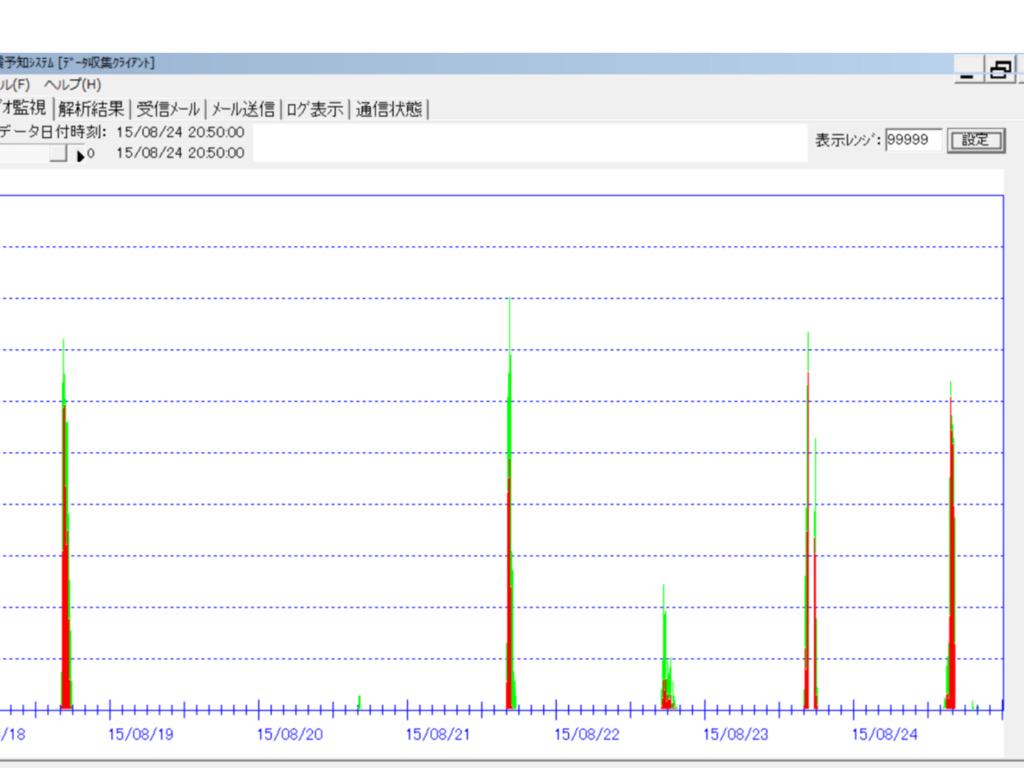 観測機1フルレンジデータです。15時にツイートした後、赤の強い反応が振り切っています。かなり大きな地震が発生する可能性があります。反応が大きくなればなるほど場所の特定が難しくなります。発生までの時間も長くなります。 #地震予知