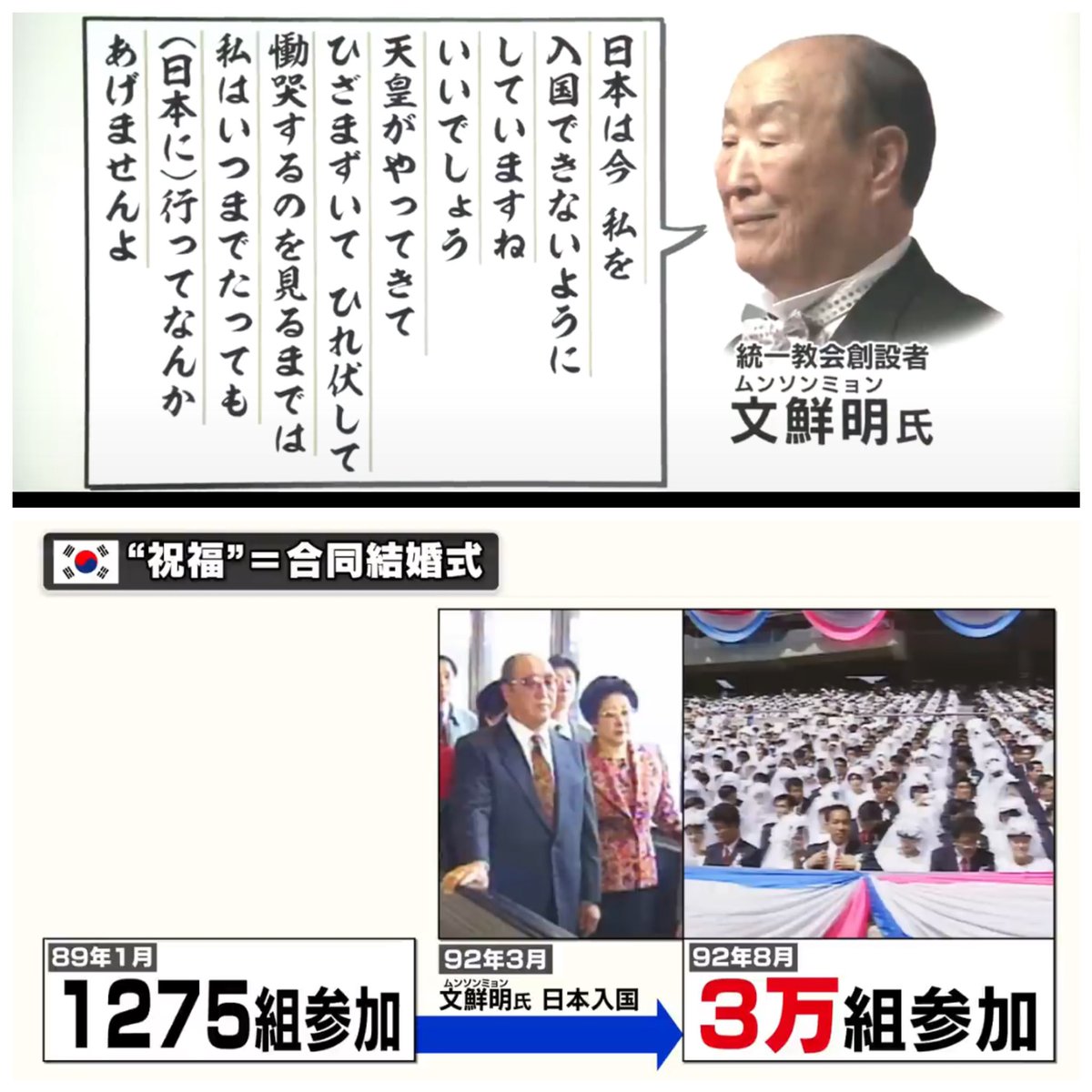 「日本に入れなかったら、日本はエバ国を剥奪されるところだった」と文鮮明氏。入国がきっかけで、合同結婚式への参加者が急増。献金額も跳ね上がった。