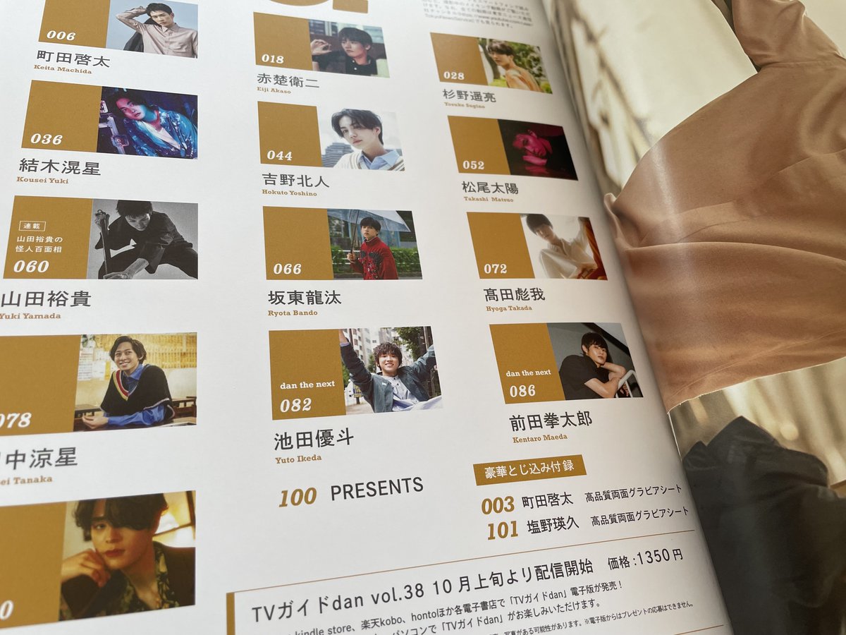 【「#TVガイドdan vol.38」9/24発売】いよいよ明日発売!ここからは気になる中身を少しずつお見せします。まずは目次から。表紙は #町田啓太 さん、裏表紙は #塩野瑛久 さんが登場。高品質グラビアシートもお楽しみに。