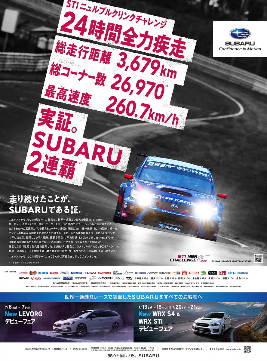 今朝の朝刊各紙に、先日の“ニュルブルクリンクチャレンジ SUBARU2連覇”の新聞広告を掲載しました。この世界一過酷なレースで鍛え上げられた数々の技術が、今日もすべてのSUBARUを走らせています。皆さま、たくさんのご声援をありがとうございました。