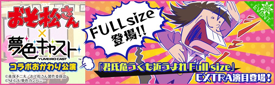 【11/8(水)14時から】「おそ松さん」第2期(第1クール)のOP「君氏危うくも近うよれ」のFull sizeがEXTRA演目に登場!Full sizeが夢色キャストで聞けます!約4分間のフル演奏をお楽しみください♪ ycast.sega-net.com/news_detail01/… #夢キャス