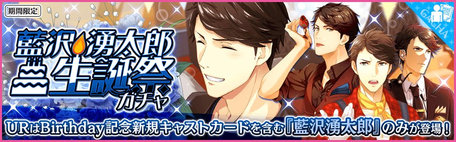 【予告】4/19(木)0時から開催!UR当選時は「藍沢湧太郎」のみが出現する生誕祭ガチャを開催!新登場の「藍沢湧太郎~Birthday~」には、ラブハリケーンイベント対象楽曲のコンボ報酬のラブptがUPするボーナス付き!お楽しみに♪ ycast.sega-net.com/news_detail01/… #夢キャス